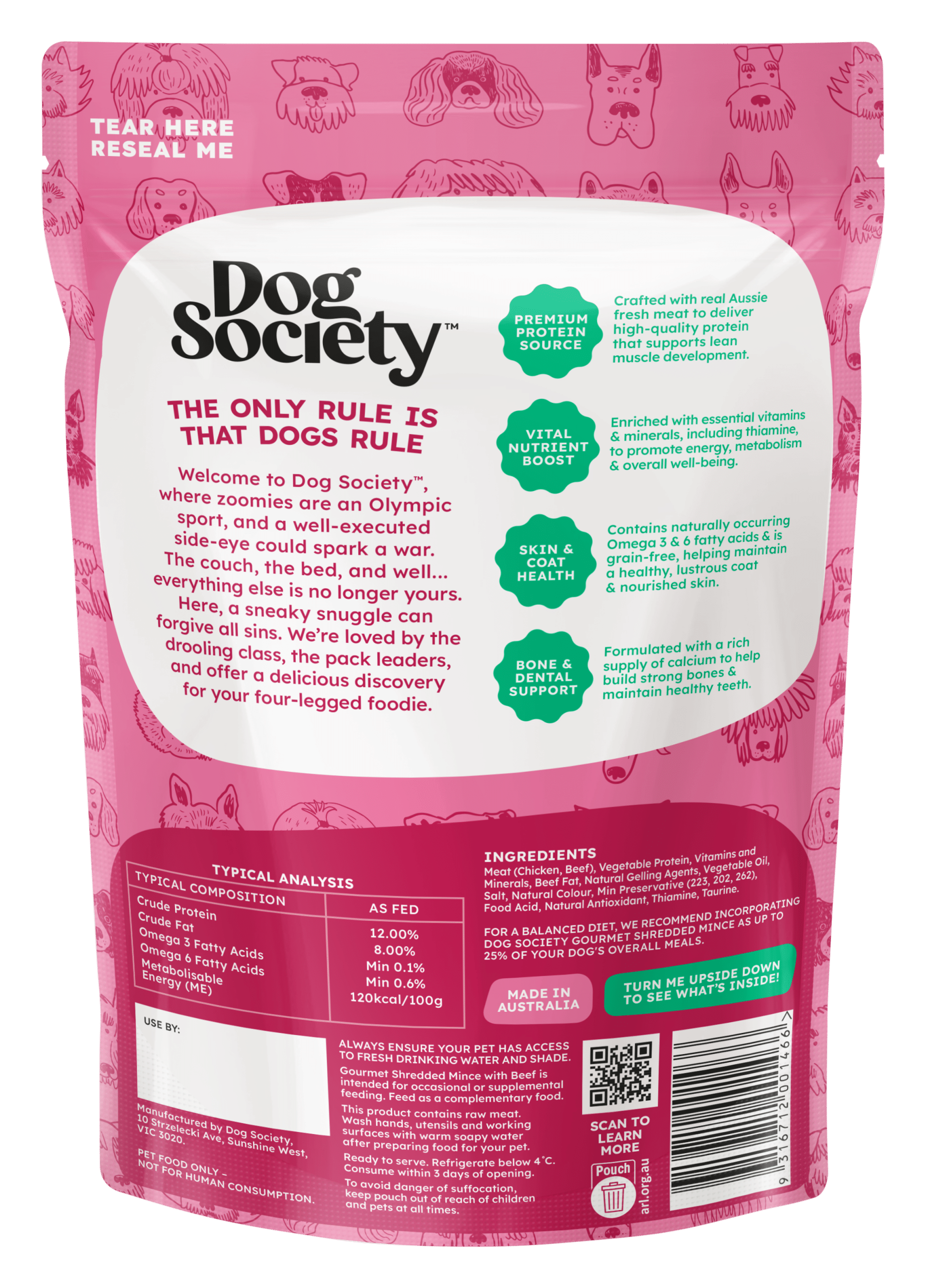 At Dog Society, we’re flipping the script on dog food. We’re not here to do standard. We’re here to make your dog’s day, every single day. Our food is made with real, high-quality ingredients and packed with flavour, fun, and personality.